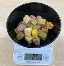 | 成分 | 粗たんぱく質 13.86% 粗脂肪 11.18% 粗繊維 0.48% 粗灰分 0.80% カロリー/100g 428kcal 内容量 8個(約40g) |